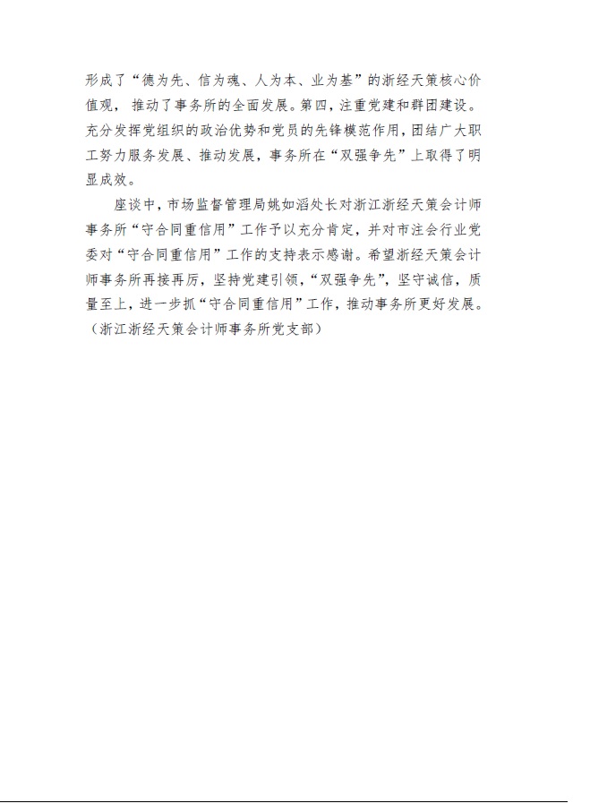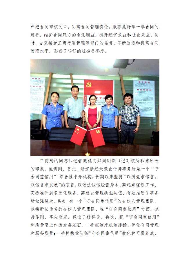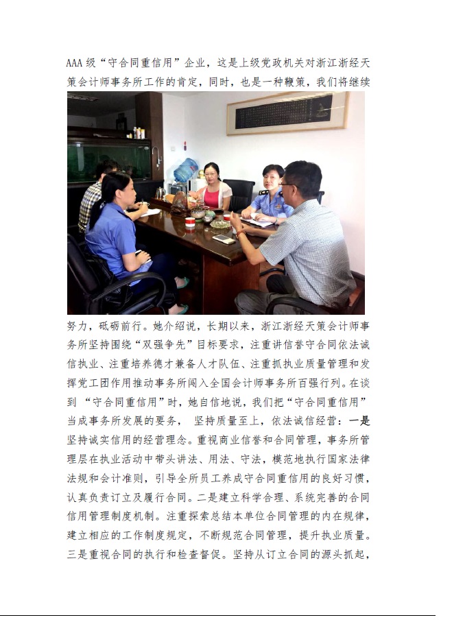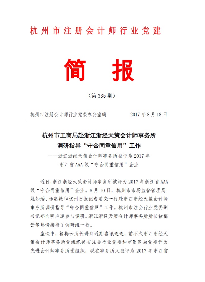 近日,浙江浙經(jīng)天策會(huì)計(jì)師事務(wù)所被評(píng)為2017年浙江省AAA級(jí)“守合同重信用”企業(yè)。杭州市工商局赴該所調(diào)研指導(dǎo)“守合同重信用”工作。詳見(jiàn)黨建簡(jiǎn)報(bào)第335期。