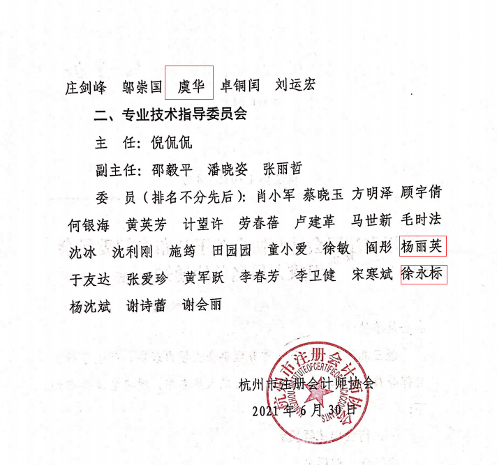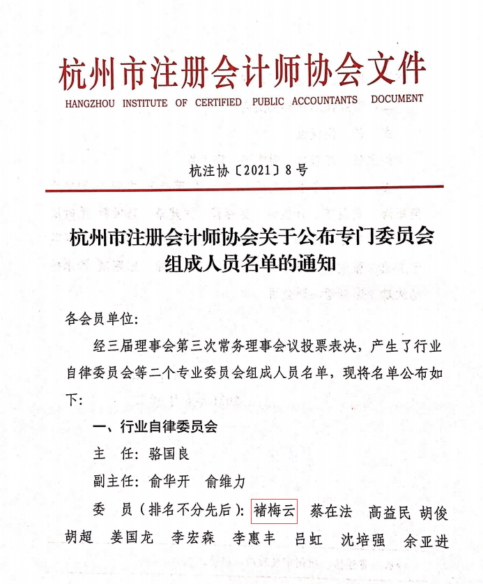 為有效發(fā)揮協(xié)會行業(yè)自律和專業(yè)服務(wù)功能,切實發(fā)揮專門委員會決策輔助和智囊團(tuán)的作用,努力提高協(xié)會服務(wù)國家、服務(wù)經(jīng)濟(jì)、服務(wù)會員的質(zhì)量和水平,根據(jù)《杭州市注冊會計師協(xié)會章程》,經(jīng)市注協(xié)三屆理事會第三次常務(wù)理事會議投票表決,產(chǎn)生了行業(yè)自律委員會和專業(yè)技術(shù)指導(dǎo)委員會。我機構(gòu)褚梅云、虞華入選行業(yè)自律委員會,徐永標(biāo)、楊麗英入選專業(yè)技術(shù)指導(dǎo)委員會。