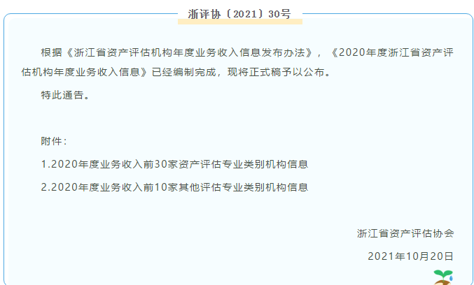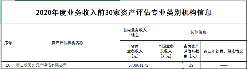 根據(jù)《浙江省資產(chǎn)評(píng)估機(jī)構(gòu)年度業(yè)務(wù)收入信息發(fā)布辦法》,《2020年度浙江省資產(chǎn)評(píng)估機(jī)構(gòu)年度業(yè)務(wù)收入信息》已經(jīng)編制完成,現(xiàn)將正式稿予以公布,浙天允資產(chǎn)評(píng)估有限公司榮登2020年度浙江省30強(qiáng),位列第26名。