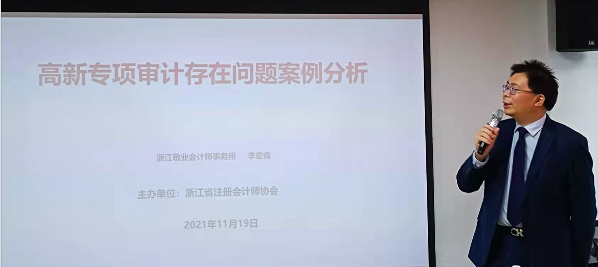 2021年11月19日,由浙經(jīng)天策事務(wù)所黨支部舉辦的服務(wù)小微企業(yè)業(yè)務(wù)培訓(xùn)班與杭州市新的社會(huì)階層人士讀書(shū)會(huì)在浙經(jīng)天策機(jī)構(gòu)17樓會(huì)議大廳舉行。讀書(shū)會(huì)邀請(qǐng)浙江省高新認(rèn)定專項(xiàng)審計(jì)專家委員會(huì)副主任、浙江省科技服務(wù)機(jī)構(gòu)專業(yè)委員會(huì)副主任、浙江敬業(yè)會(huì)所所長(zhǎng)李宏森進(jìn)行了“高新專項(xiàng)審計(jì)存在問(wèn)題案例分析”專題講座。參加繼續(xù)教育的注冊(cè)會(huì)計(jì)師、小微企業(yè)、社會(huì)組織等相關(guān)負(fù)責(zé)人及財(cái)務(wù)人員等100余人參加。