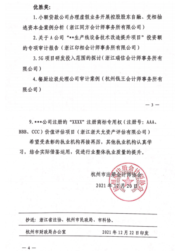 日前,為提高市注冊(cè)會(huì)計(jì)師、資產(chǎn)評(píng)估師執(zhí)業(yè)水平,有效解決執(zhí)業(yè)中遇到的疑難問題,市注協(xié)開展了2021年度行業(yè)優(yōu)秀案例征集活動(dòng),我機(jī)構(gòu)簡(jiǎn)兆煌、虞華二人報(bào)送的《***公司注冊(cè)的“XXXX”注冊(cè)商標(biāo)專用權(quán)(注冊(cè)號(hào):AAA、BBB、CCC)價(jià)值評(píng)估項(xiàng)目》案例,經(jīng)市注協(xié)會(huì)組織的專家評(píng)審,榮獲優(yōu)勝獎(jiǎng)。