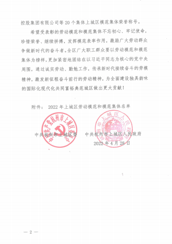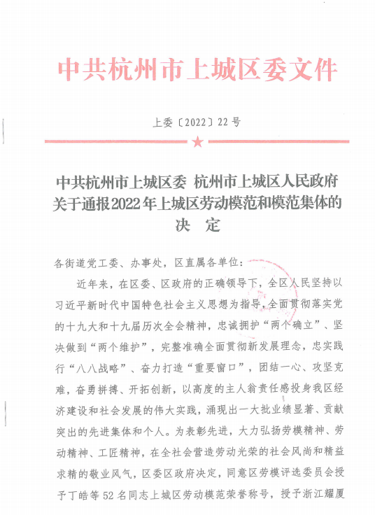 喜報!我公司榮獲上城區(qū)集體勞動模范表彰