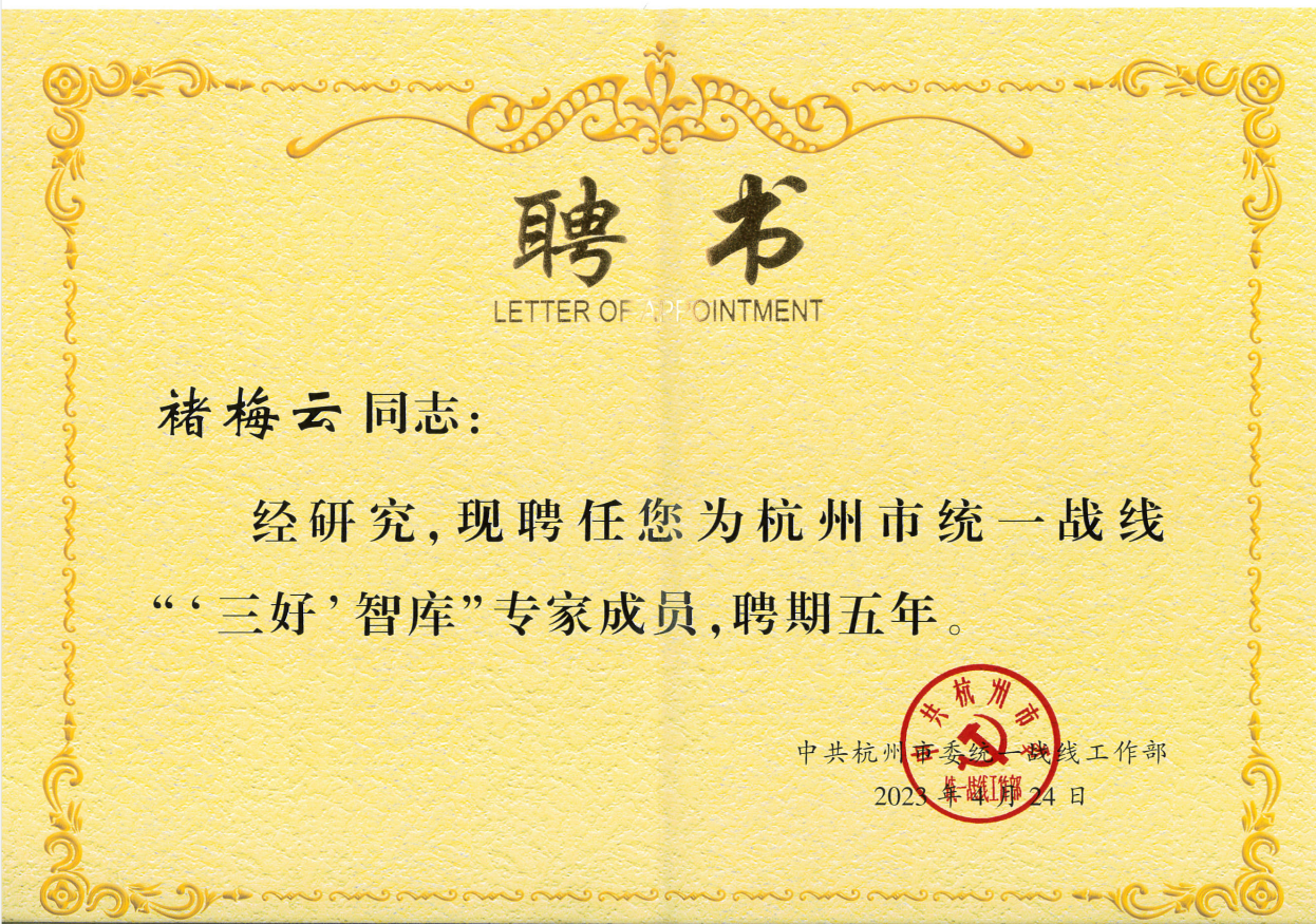 喜報(bào)|我公司董事長褚梅云被杭州市統(tǒng)戰(zhàn)部聘為“‘三好’智庫”專家成員
