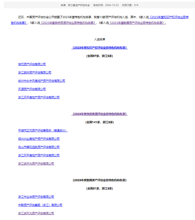 近日,中國(guó)資產(chǎn)評(píng)估協(xié)會(huì)公開披露了2023年度特色機(jī)構(gòu)名錄。浙江省共11家機(jī)構(gòu)入選,5家入選《2023年度知識(shí)產(chǎn)權(quán)評(píng)估業(yè)務(wù)特色機(jī)構(gòu)名錄》,5家入選《2023年度自然資源評(píng)估業(yè)務(wù)特色機(jī)構(gòu)名錄》,3家入選《2023年度數(shù)據(jù)資產(chǎn)評(píng)估業(yè)務(wù)特色機(jī)構(gòu)名錄》。浙天允評(píng)估憑借在自然資源評(píng)估、數(shù)據(jù)資產(chǎn)評(píng)估評(píng)估領(lǐng)域的深厚積累與專業(yè)優(yōu)勢(shì),被列入2023年度自然資源評(píng)估、數(shù)據(jù)資產(chǎn)評(píng)估業(yè)務(wù)特色機(jī)構(gòu)名錄