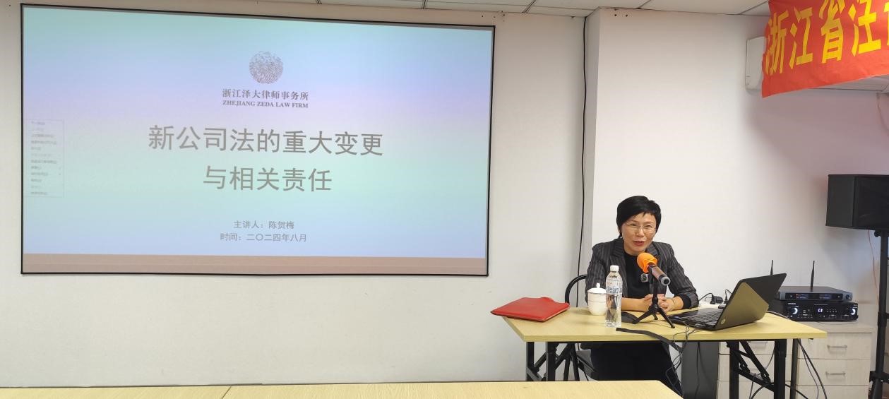 新修訂的《中華人民共和國公司法》已于2024年7月1日起施行,為做好新《公司法》的理解與適用,規(guī)范和完善企業(yè)經(jīng)營管理,助力企業(yè)降本增效,本次培訓邀請浙江澤大律師事務所高級合伙人陳賀梅律師進行專題授課。陳律師圍繞新《公司法》的重大變更、新《公司法》中的相關責任方面展開講解,對新《公司法》部分重大修改要點進行了深入淺出的解讀,通過新舊法條對比,結合生動鮮活的案例,深刻揭示了新《公司法》對企業(yè)治理結構優(yōu)化、股東權益強化保護等領域的深遠影響,激發(fā)了大家對于企業(yè)治理與法律合規(guī)的深刻思考,贏得了在場人員的陣陣掌聲,更為企業(yè)預防和化解法律風險提供了有力保障。